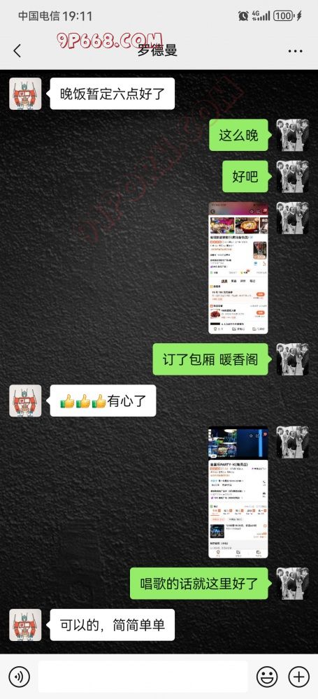 然后我就订好酒店,下午4点钟办理入住,和他约好晚饭时间以后订好饭店包厢和KTV。